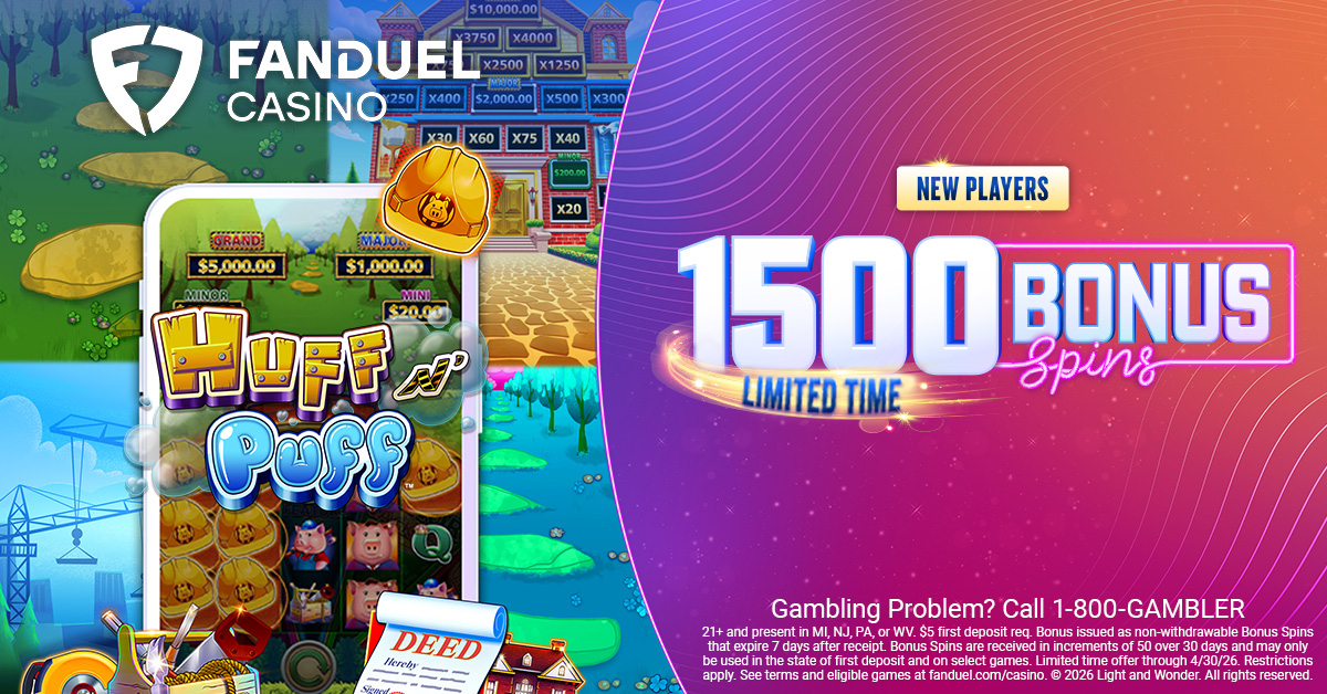 21+ and present in MI, NJ, PA, or WV. $5 first deposit req. Bonus issued as non-withdrawable Bonus Spins that expire 7 days after receipt. Bonus Spins are received in increments of 50 over 30 days and may only be used in the state of first deposit and on select games. Limited time offer through 4/30/26. Restrictions apply. See terms and eligible games at fanduel.com/casino.
